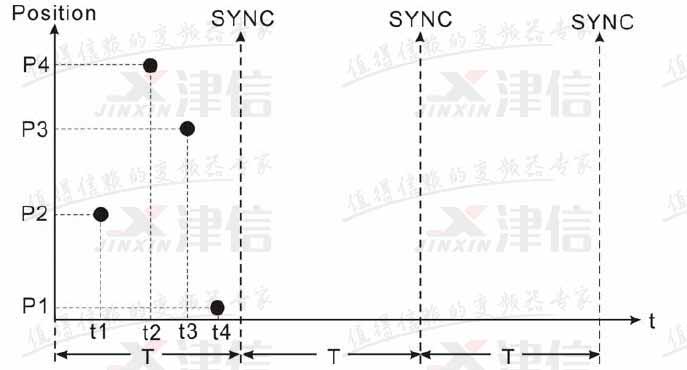 10MC 接有四臺(tái)伺服驅(qū)動(dòng)器,T 為同步周期。在同步周期內(nèi),四臺(tái)伺服驅(qū)動(dòng)器分別在不同的時(shí)刻(t1、t2、t3、t4)接受到控制數(shù)據(jù),但是控制數(shù)據(jù)并沒(méi)有生效。當(dāng)伺服驅(qū)動(dòng)器接收到同步信號(hào)(SYNC),控制數(shù)據(jù)同時(shí)生效。