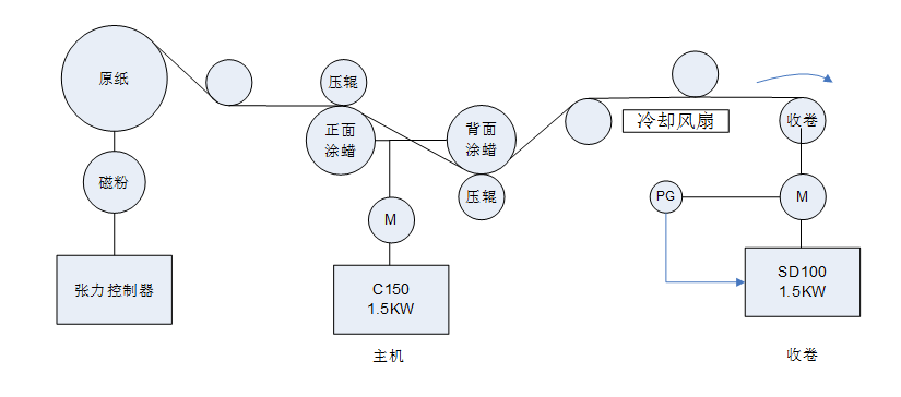 整機以涂蠟部位作為主機,收卷采用錐度張力收卷,整機速度在150-200 m/min運行。