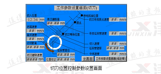 石英切割機(jī)有三個(gè)控制部分構(gòu)成:切刀旋轉(zhuǎn)控制、切刀位置控制和送料位置控制。切刀旋轉(zhuǎn)控制只要速度可調(diào)即可;切刀位置控制需要在切割石英管或石英棒的過程中控制其位置和不同段內(nèi)的速度,首先要保證切割產(chǎn)品的刀口質(zhì)量,同時(shí)要提高生產(chǎn)效率;送料位置控制需要每次往前送設(shè)定長度的石英管或石英棒,精度要求0.2毫米。